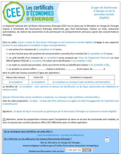 Pour encourager les fournisseurs d’énergie à promouvoir l’efficacité énergétique, l’État a mis en place les Certificats d’Économies d’Énergie. Ce dispositif oblige votre fournisseur d’énergie (gaz, fioul, électricité…) à vous aider à réaliser vos travaux visant à réduire votre consommation énergétique.