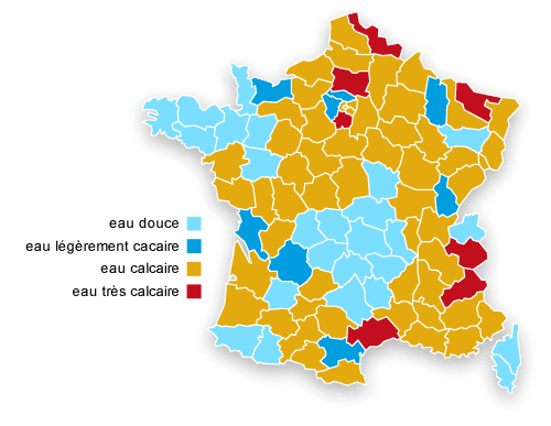 Selon la région française où vous vivez, l’eau de votre robinet est plus ou moins dure, c’est-à-dire que l’eau n’a pas la même teneur en calcaire partout.