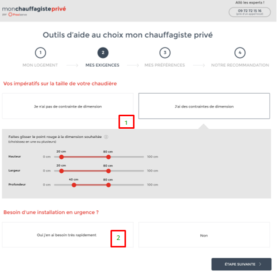 Vous êtes maintenant sur la première page / étape de l’outil. Tout au long de ce parcours vous aurez juste à cliquer sur les bonnes cases ou bouger les réglettes (dimensions).